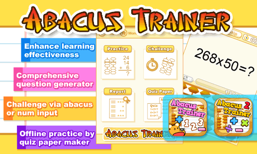 Abacus learning package tailor-made for children to learn mental arithmetic through step by step demonstration of techniques and concepts in 9 interactive tutorials, and to do abacus drillings in 7 entertaining games.