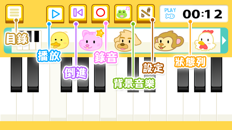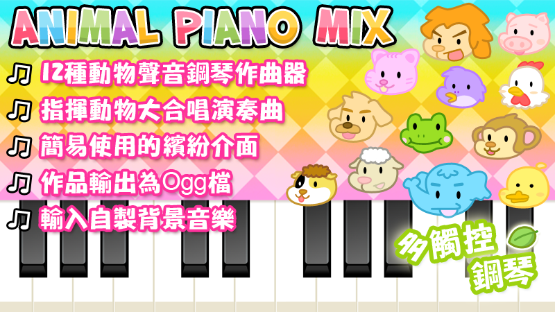 音樂是人類共通的語言,世界上任何人無分國籍膚色文化都可以透過音樂溝通與理解。軟件提供鋼琴聲及12種動物聲音,各配以36個音階調子,讓小朋友認識世界上不同的動物之外,鼓勵他們發揮作曲天分與爆發無限的創意潛能。 | ||