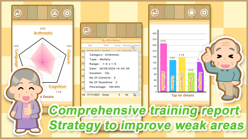 Performance reporting are thoroughly recorded for analysis, allowing caregivers to gain insights into the patient’s strengths and weaknesses, and thereby develop targeted training diagnosis programs to address weaker areas. Additionally, non-patients are able to perceive their conditions in early reversible stage and strengthen their training as preventative measures to potential issues. | ||||||||||||||||||||