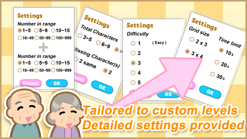 Customising the games according to individual needs, with adjustable difficulty levels and type of training, avoids seniors being discouraged by overly difficult levels, while still enjoying the fun of a challenge. | ||||||||||||||||||||