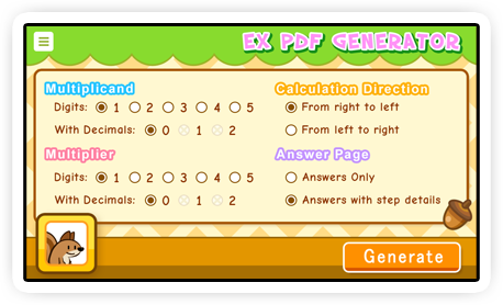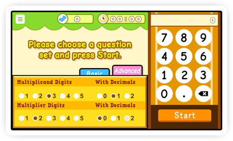 | | Mainly focus on multiplier / divisor of 2 to 12, while user can choose to challenge any length of multiplicand / dividend digits, ranged from 1 to 5. | |