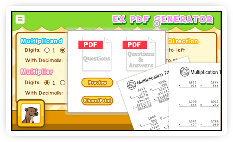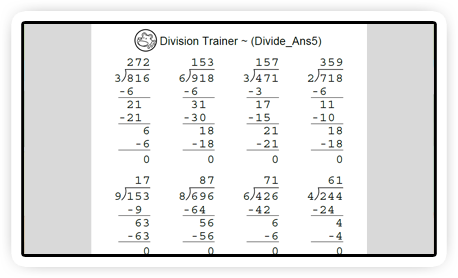 | | Questions can be customised with/without remainder, answers papers can be additionally generated with/without steps.